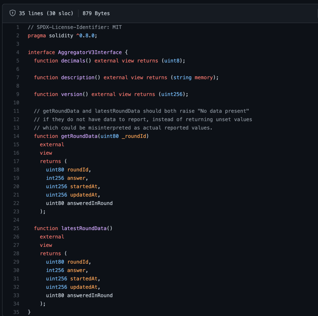 What exactly is this line doing, though? Basically, we are importing code from the chainlink/contracts npm module. If you go to the project’s Github (here), and follow the path in the import statement (here), you will get to the code where they define the AggregatorV3Interface interface. So, basically, we are importing the AggregatorV3Interface interface into our project so we can work with it.