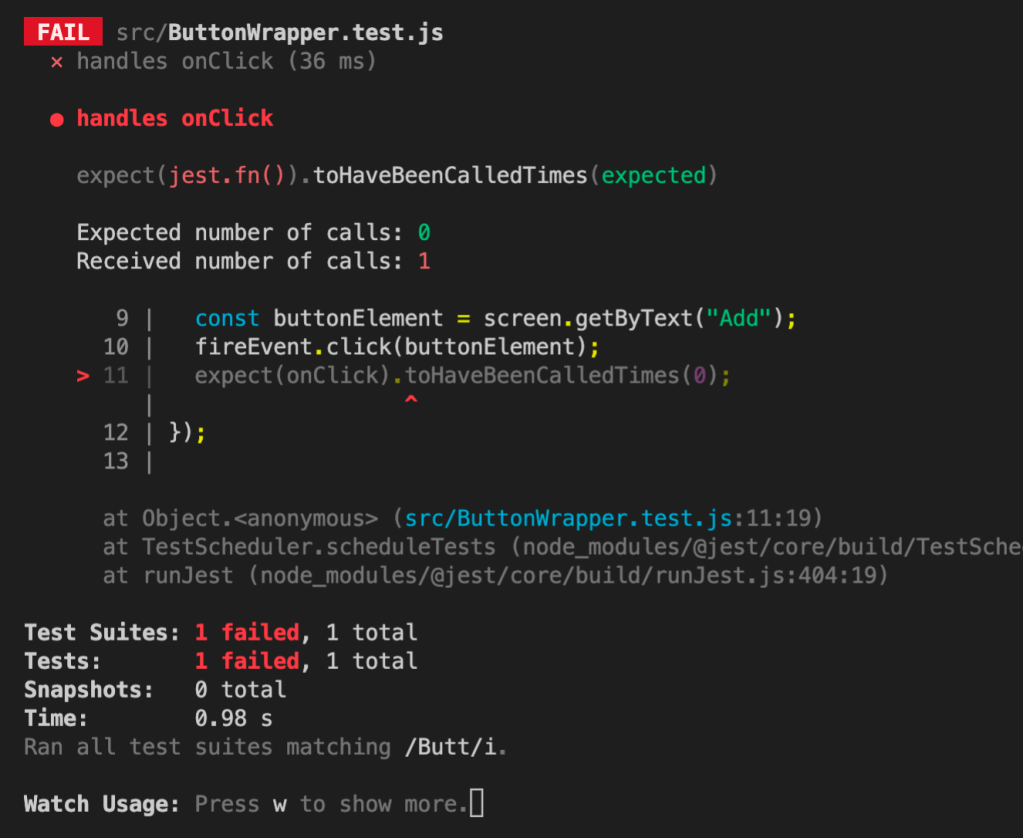 This test will not pass because we know that the button was clicked once by the fireEvent call. The output should look like this: